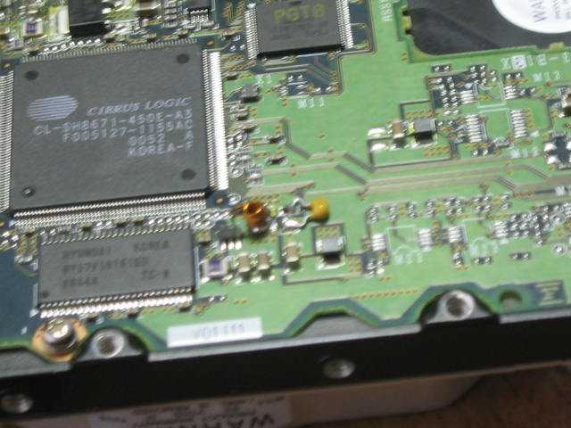 Встал, отряхнулся, пошёл потихоньку дальше. Притащил, включил. Тишина... Не крутиться. Ну, думаю - кирдык. Перевернул, посмотрел повнимательней - разбиты две керамические хреновины на плате. Нашёл три похожих на этот участка - на всех стоит маленький кондёр и катушка параллельно, видимо какие-то фильтры, от помех. Припаял китайский кондёр, первый что подвернулся из мелких, и "катушку" из нескольких витков проволоки. Включил - крутится. Выключаю, подрубаю к компу - загружается Win2000 и я радостно вижу, что в списке дисков пополнение. Пашет.