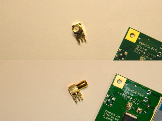 На плате уже имеются отверстия для установки Г-образного ВЧ-разъёма. Оставалось определиться с его типом. Что бы получить решение совместимое с другими WiFi-антеннами было решено поставить RP-SMA разъём. В конце статьи приведено более подробное описание данного разъёма и причин его применения.